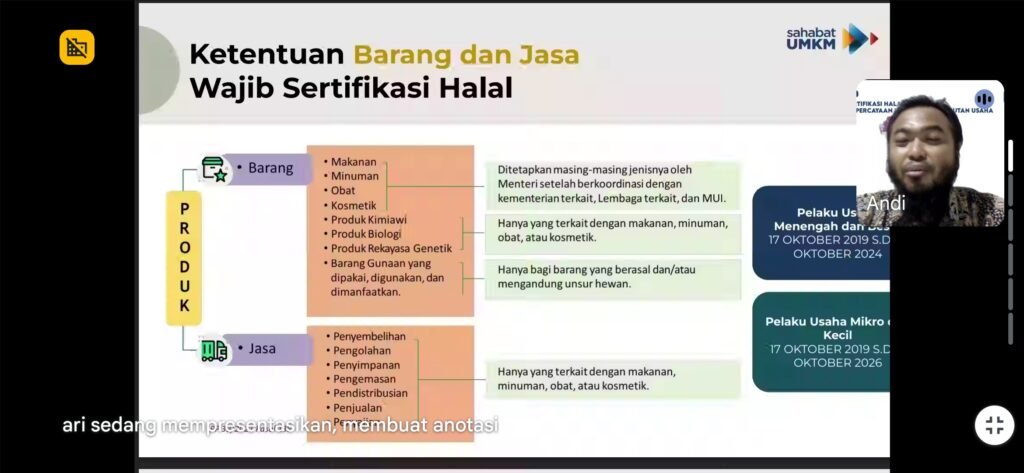 Acara yang berlangsung selama satu jam melalui Google Meet ini menghadirkan Andi Setyadi, auditor halal senior dari Halal Corridor, dan diikuti hampir 40 peserta dari berbagai daerah di Indonesia.